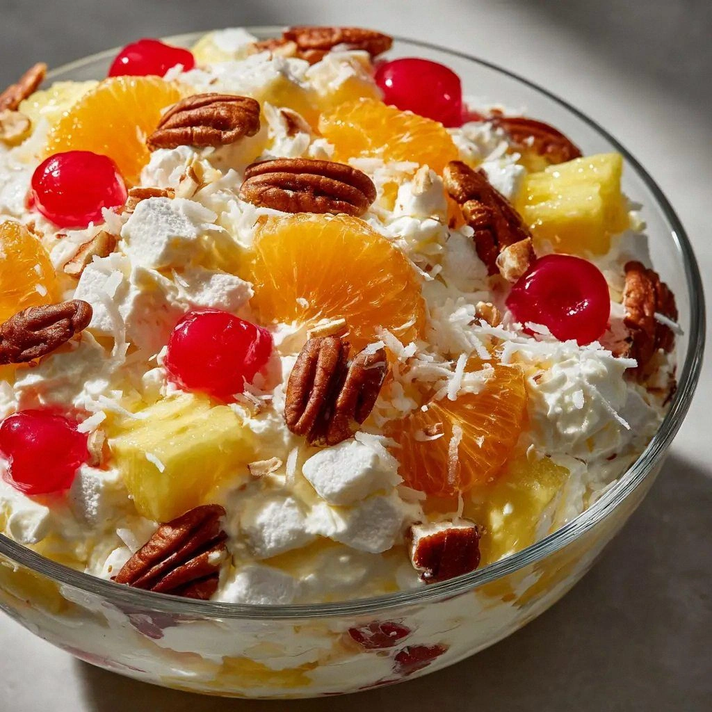 Picture this: a bowl that glistens like a crystal lake, speckled with bright mandarin orange chunks that pop like fireworks in your mouth, and the buttery crunch of pecans that crunch with every bite. The whipped topping swirls like clouds, and the sour cream anchors it all with a tang that cuts through the sweetness like a lighthouse beam. As you stir, the marshmallows bob like tiny islands, and the shredded coconut adds a whisper of tropical sand. The entire dish feels like a carnival of textures, a symphony of flavors that dance on your tongue. And the best part? You can make it ahead of time and let it chill, so it’s ready to serve when your guests arrive.