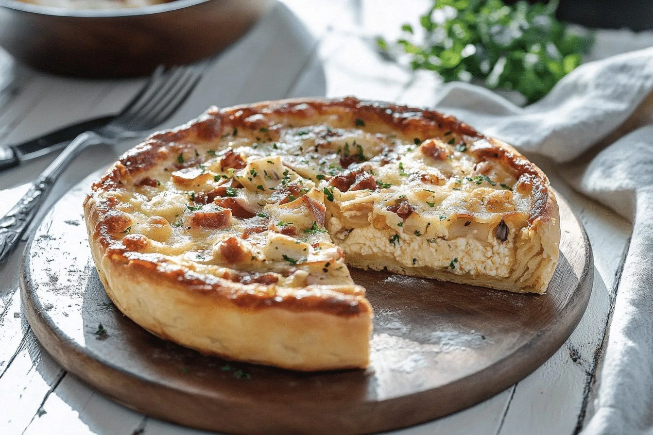 Use a vegan pie crust and substitute eggs with aquafaba or flaxseed meal. Replace mozzarella with a plant‑based mozzarella alternative and ricotta with a cashew‑based ricotta. This approach keeps the texture creamy while eliminating dairy, making the dish suitable for vegans.